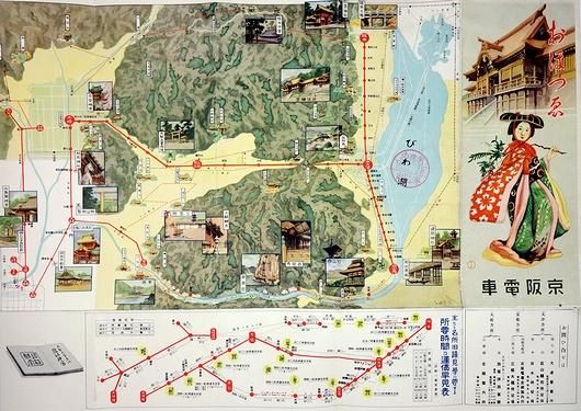 ■著者名: ■出版元:京阪電車 ■刊行年:戦前 ■サイズ:26.5×37.5cm(展開時) ■状態:表紙部分の縁、折目に少しイタミあり。その他は経年の古色は見られるものの、おおむね良好な状態。 ■内容:京阪電車沿線名所旧蹟案内。料金表、運賃表、鳥瞰図風イラスト地図入。