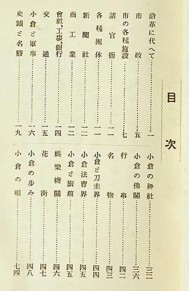 交通、小倉と軍事、行事、名物、小倉法曹界、娯楽機関、花街、小倉の歩み(明治元年から昭和七年まで)、小倉の唄、他。