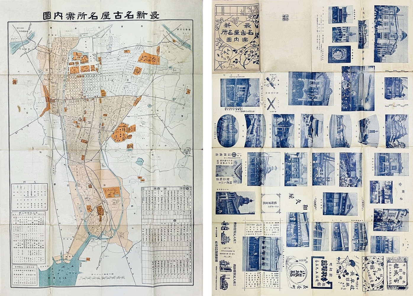 ■著者名:飯田信馬 ■出版元:小長谷勝之助(発行兼印刷者) ■刊行年:大正2年7月1日 ■サイズ:79.5×54.5cm ■状態:折目に小穴、少補修が見られるが、おおむね良好な状態 。 ■内容: (表)最新名古屋名所案内図 (裏)広告および写真32点入 地図全体の画像はこちらをクリック