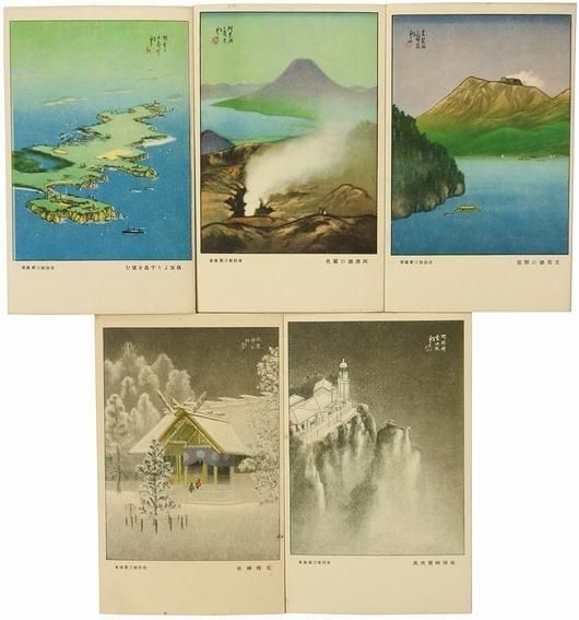 ■著者名:吉田初三郎(画) ■出版元:北海道庁、北海道勝景地協会 ■刊行年:戦前 ■サイズ:36.5×53.5cm(展開時) ■状態:タトウに経年スレ等の古色あり。絵葉書は古色が見られるものの良好な状態。 ■内容:大沼公園、層雲峡銀河の瀧、然別湖の春色、小樽港の月明、大雪山と旭橋、支笏湖の静寂、阿寒湖の麗色、根室より千島を望む、地球岬雪吹雪、札幌神社、以上絵葉書10枚入(通信面未使用)。タトウ付。