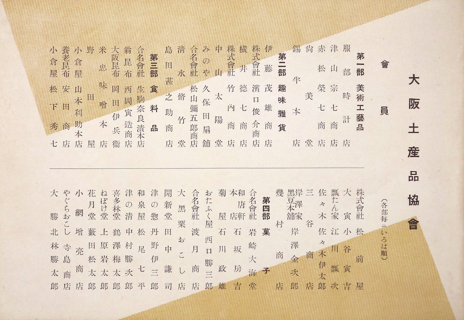■内容:大阪土産品協会は昭和11年12月、大阪市役所産業部の斡旋により、大阪市内の土産品取扱業者を会員として組織された。土産品の改善向上に関する研究、販路拡張、および会員相互の商勢伸長を目的とした。