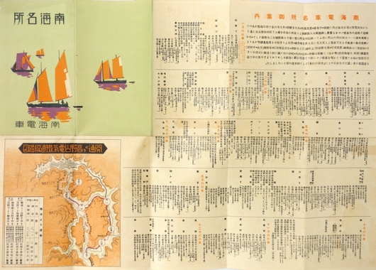 ■著者名: ■出版元:南海電車 ■刊行年:戦前 ■サイズ:27×38cm(展開時) ■状態:経年の古色は見られるものの、おおむね良好な状態。 ■内容:南海沿線名所一覧図、南海電車名所御案内、開通せる高野山電気鉄道線路図、他。