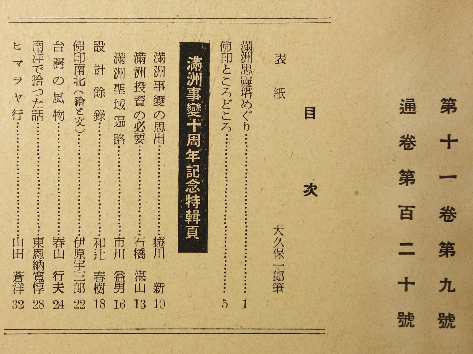 ■著者名: ■出版元:大阪商船株式会社 ■刊行年:昭和16年9月1日 ■サイズ:B5判、32ページ ■状態:経年の古色は見られるものの、おおむね良好な状態。 ■内容:満州事変十周年記念特輯頁 満洲忠霊塔めぐり、満州事変の思出(蜷川新た)、満洲投資の必要(石橋湛山)、台湾の風物(春山行夫)、他。 目次の拡大画像はこちらをクリック