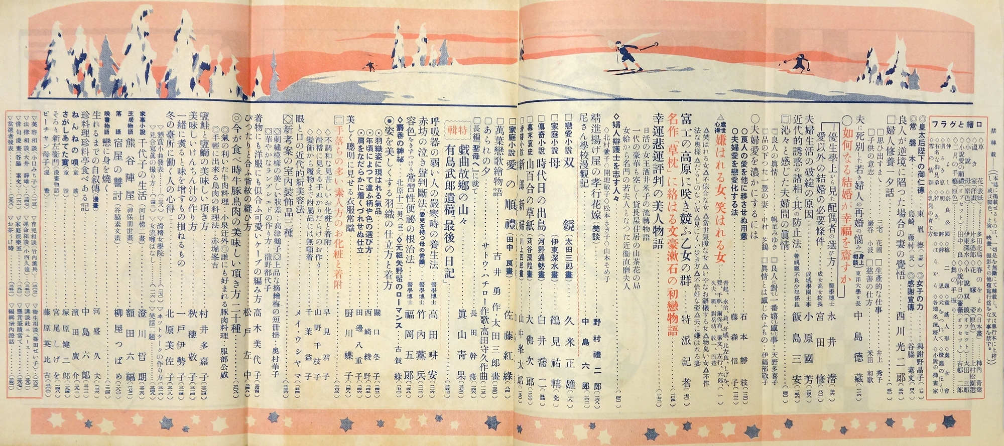 ■内容:双鏡(久米正雄)、山百合の出島(大佛次郎)、新郎新婦(山中峯太郎)、昨日の薔薇(加藤武雄)、愛の巡礼(佐藤紅緑)、眼と口の近代的新美容法(メイ・ウシヤマ)、名作「草枕」に絡はる文豪漱石の初恋物語、他。