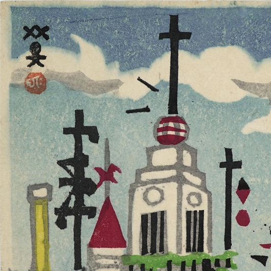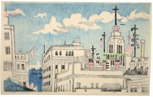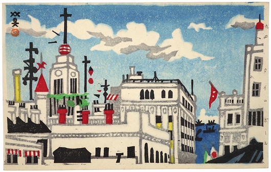 ■著者名:川西英(自刻自摺) ■出版元: ■刊行年:昭和10年(1935) ■サイズ:16.7×26.3cm ■状態:保存状態は良好。 ■内容:昭和8年(1933)から昭和11年(1936)にかけて制作された川西英の代表作「神戸百景」は昭和11年10月20〜22日に神戸大丸「神戸百景版画展」で発表された。 本作「タイム・ボール」について、池長孟が昭和19年(1944)に書いた解説によると、「タイム・ボールのあるのが水上警察署。その手前の屋上に青い草の生えているのがオリエンタル・ホテル。その右側が大阪商船会社。」