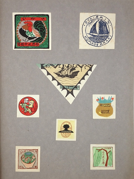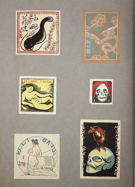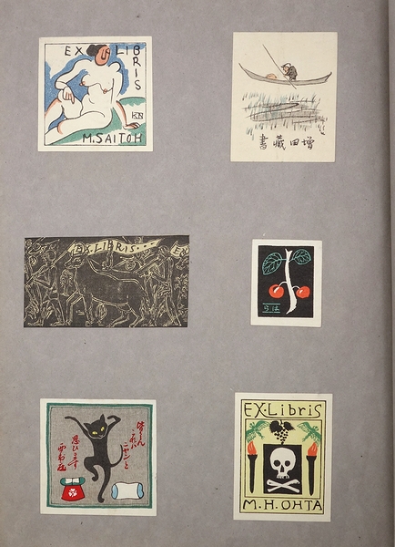 表紙を含めて蔵書票85枚が貼り込まれている。同一人物の異なった絵柄の蔵書票が貼り込まれている例はあるが、同一絵柄の重複はない。