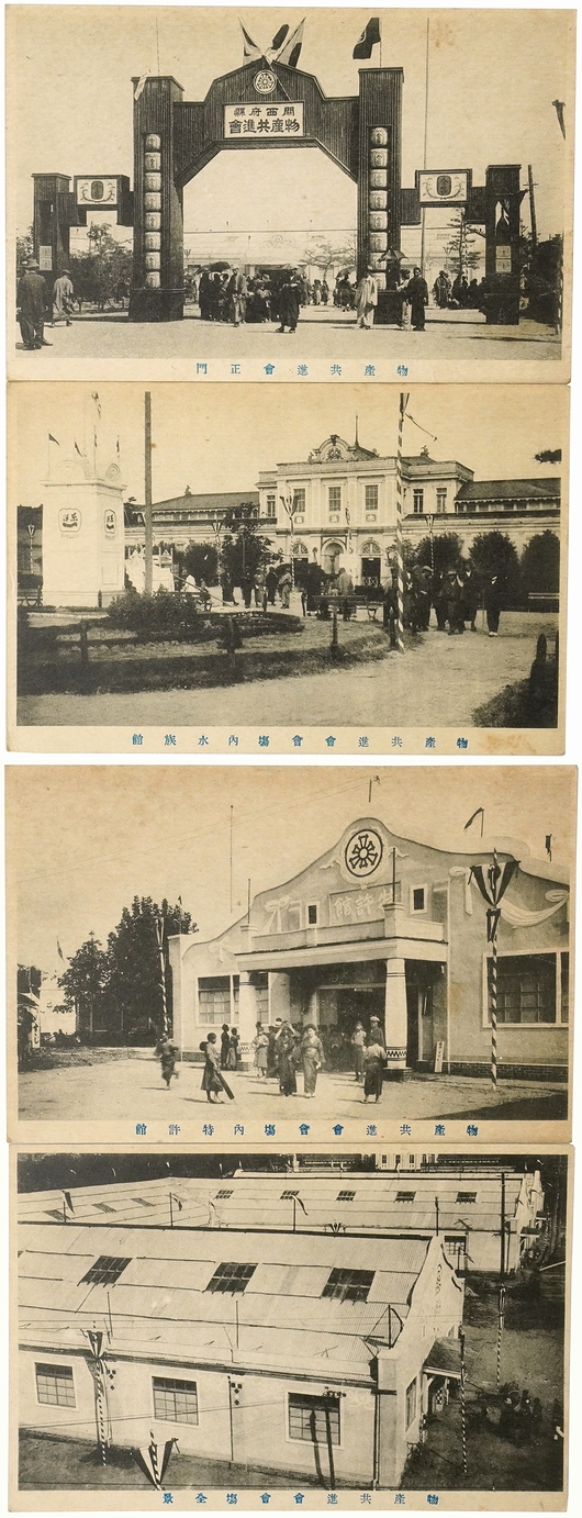 ■著者名: ■出版元: ■刊行年:戦前 ■サイズ: ■状態:袋に経年ヤケ、イタミあり。絵葉書は経年の古色が見られるものの、おおむね良好な状態。 ■内容:「物産共進会正門」「物産共進会会場内水族館」「物産共進会会場内特許館」「物産共進会海上全景」以上の絵葉書4枚。袋付。