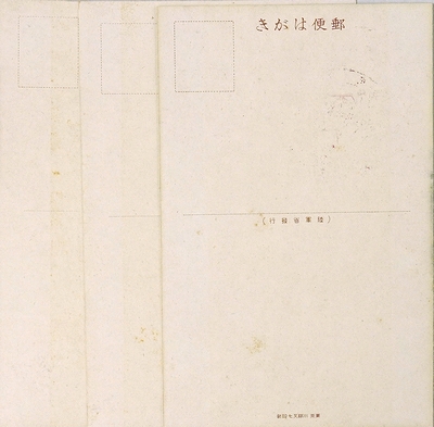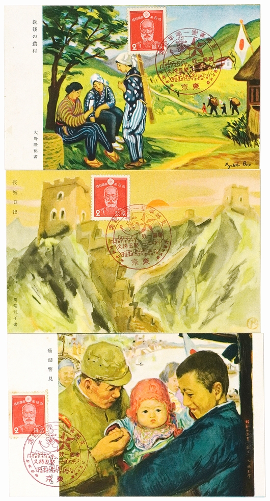 ■著者名: ■出版元:陸軍省 ■刊行年:昭和15年 ■サイズ: ■状態:経年の古色は見られるものの、おおむね良好な状態。 ■内容:銃後の農村(大野隆徳)・長城日出(川端龍子)・蕪湖瞥見(五味清吉)、以上の絵葉書3枚入。袋付。