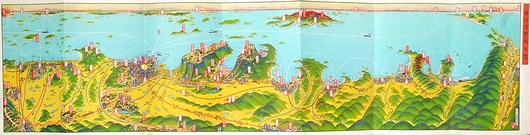 ■著者名:高松三越図案部(作) ■出版元:香川県国立公園協会(香川県庁公園課内) ■刊行年:昭和10年3月20日 ■サイズ:15.4×60.5cm(展開時) ■状態:経年の古色は見られるものの良好な状態。 ■内容:(表)讃岐遊覧鳥瞰図、(裏)観光案内(写真11点入)。表紙内側に交通案内あり。