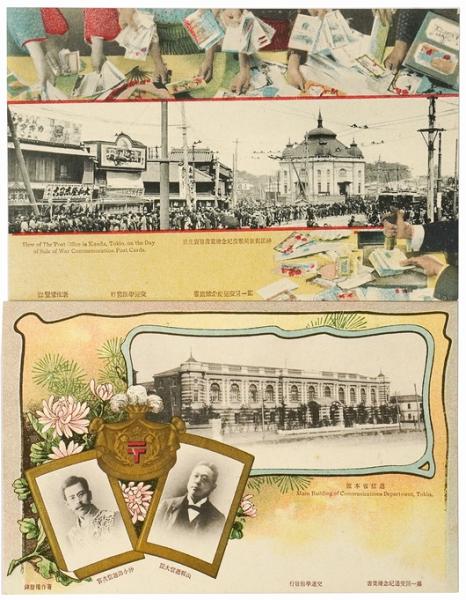 ■内容:神田郵便局戦役紀念絵葉書販売光景、逓信省本館等、絵葉書2枚入(うち1枚にエンボス加工あり)。袋付。