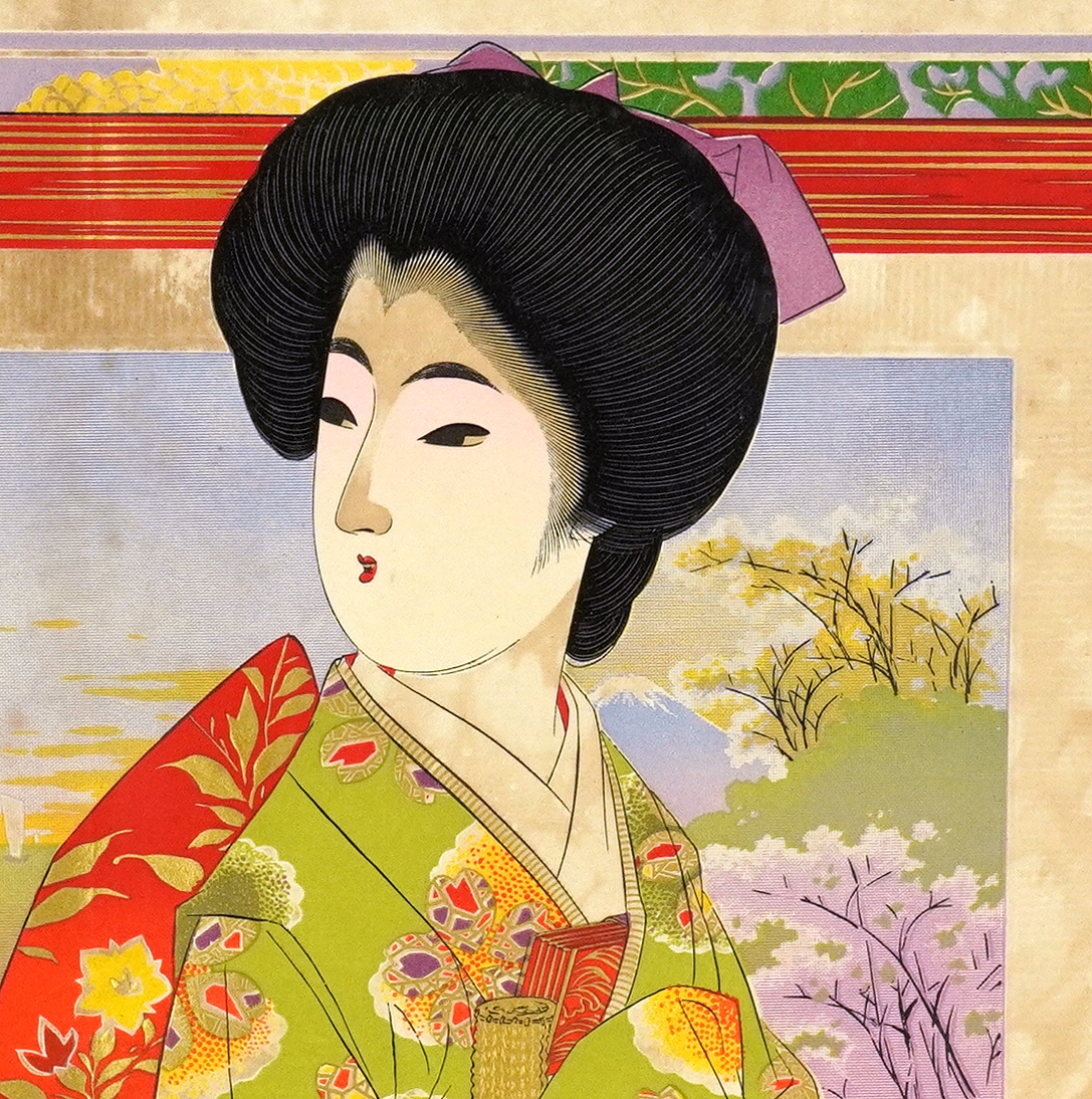 ■著者名: ■出版元: ■刊行年:戦前 ■サイズ:37×51.5cm ■状態:余白部に綴穴あり。中折あり。経年シミ等の古色あり。 ■内容:彩色石版刷、エンボス加工あり。 一部分を拡大してみる